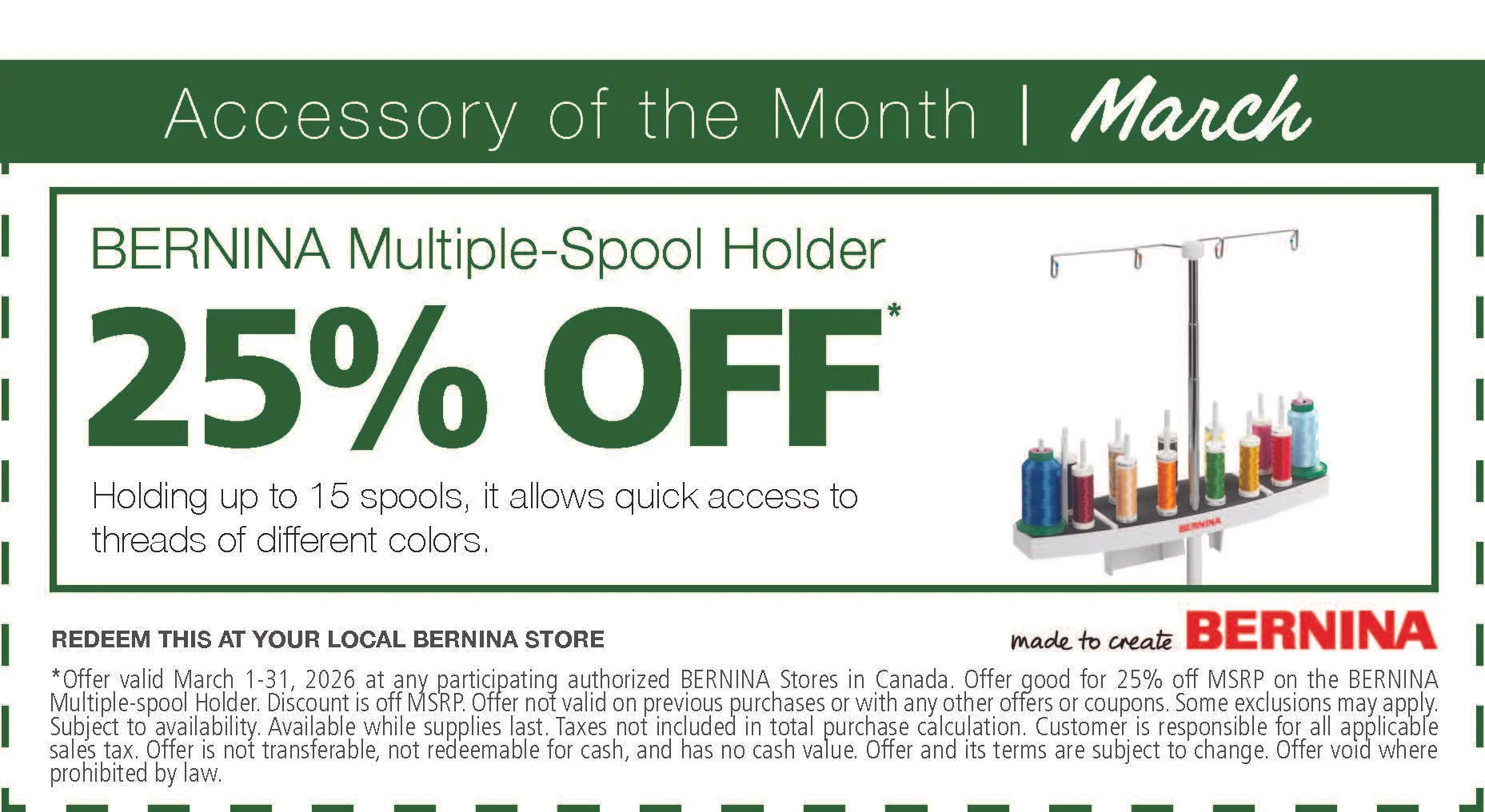 Bernina foot of the Month for March is the Bernina Multiple-Spool Holder at 25% off